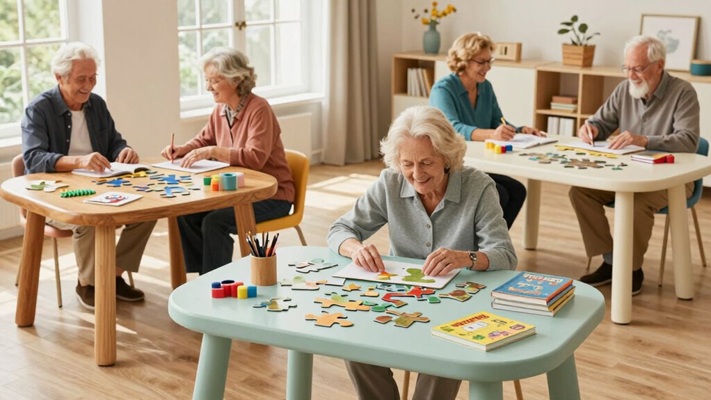 Yes, there are activity tables designed specifically for cognitive and sensory stimulation. I’ve seen tables with textured surfaces, colorful visual puzzles, and tactile elements that engage the senses and promote mental activity. These features help enhance focus, memory, and sensory processing, making them ideal for older adults with cognitive or sensory needs. I recommend choosing tables that combine these stimulating features with safety elements to guarantee comfort and security.